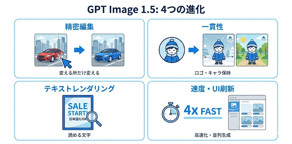 GPT Image 1.5(ChatGPT Images)は、「業務で使える画像生成AI」として大きく進化しました。特に 精密編集一貫性の保持高速化 の3点は、実務での使い勝手を大きく向上させています。