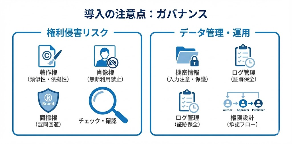 画像生成AIを導入する際、最も重要なのがガバナンスの設計です。技術的な性能だけでなく、法的リスクや運用ルールを整備しないと、後々大きな問題になりかねません。