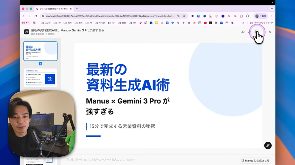 2. 資料作成(Manus):リサーチ結果をもとに、デザイン性の高いスライドを自動生成