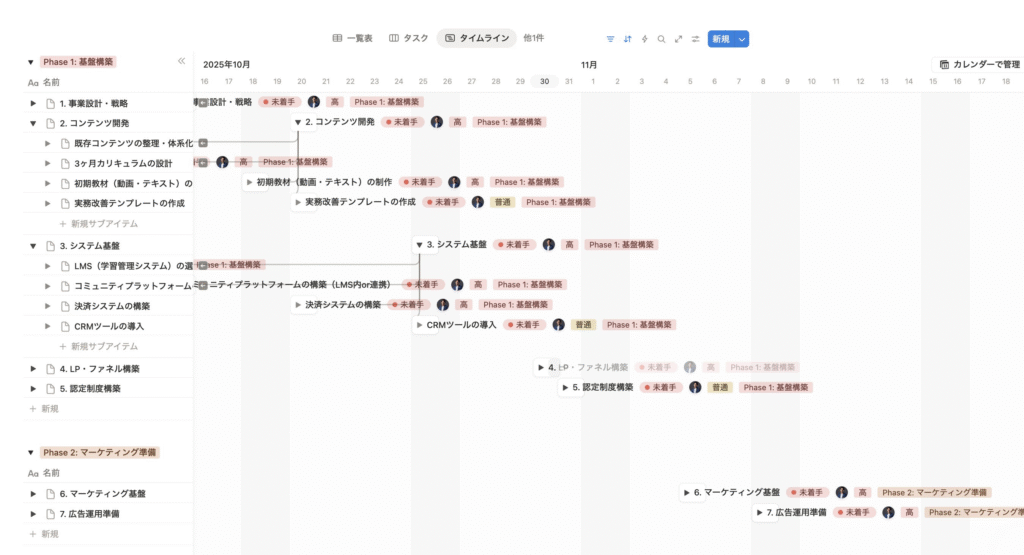 そうしてnotionに完成したのがこちらです。今回は、C向けスクール事業の事業戦略ガントチャートを作成しました。