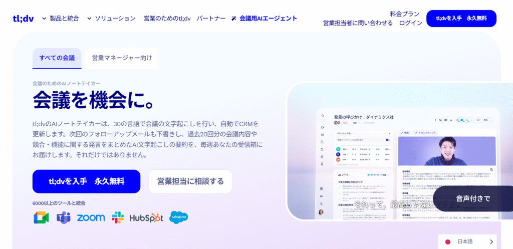 - CRM連携:Salesforce、HubSpotなどと連携し、商談データを自動保存