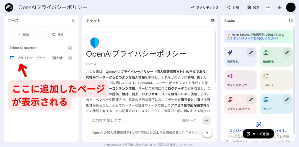 ▼ステップ2:NotebookLMにURLを読み込ませる(30秒)