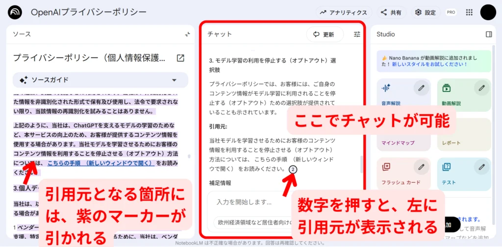 するとどうでしょう。NotebookLMが、まるで専門家のように、長大なプライバシーポリシーの中から的確な答えを引用付きで瞬時に返してくれます。