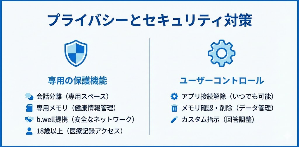 - 健康情報は分離・暗号化など保護を強化し、原則として学習に使われない設計。