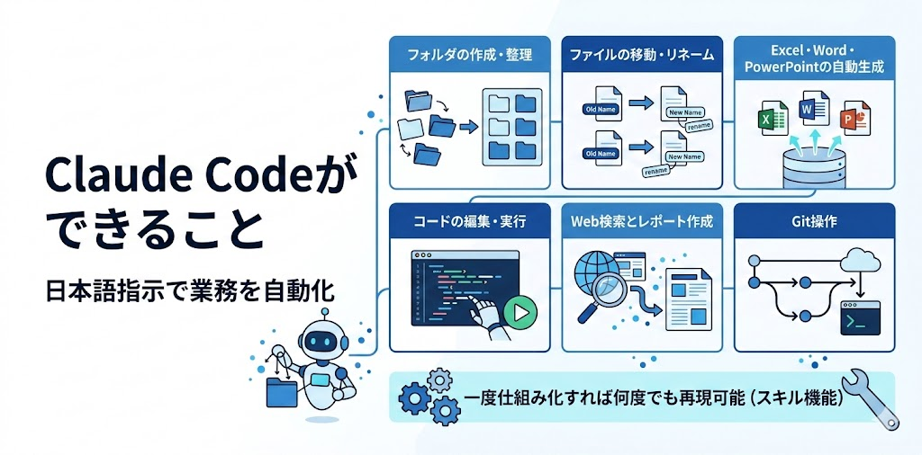 しかも、これらの操作を一度仕組み化すれば何度でも再現可能です。Claude Codeには「スキル」という機能があり、一度行った作業をテンプレート化して繰り返し使うことができます。資料作成や定型レポートのような業務であれば、毎回ゼロからプロンプトを書く必要がありません。