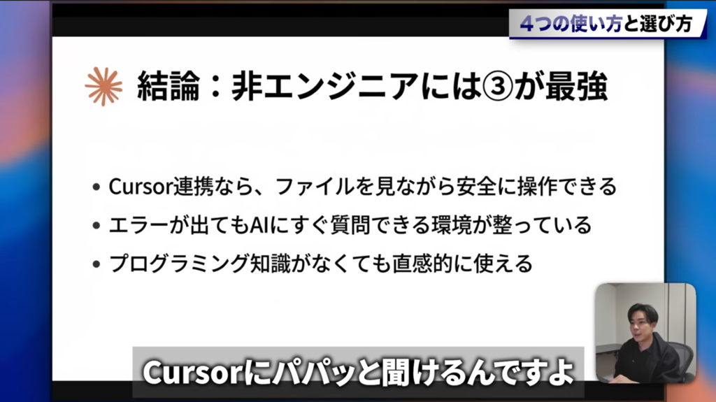 - 使い方は4つあるが、初心者にはCursor連携が最強。ファイルの変化を見ながら安全に操作でき、エラー時もAIにすぐ質問できる