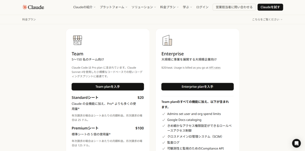 | Team | $25/ユーザー/月(年払い$20) | 5〜150名の組織向け。SSO、管理機能、50万トークンのコンテキストウィンドウ |