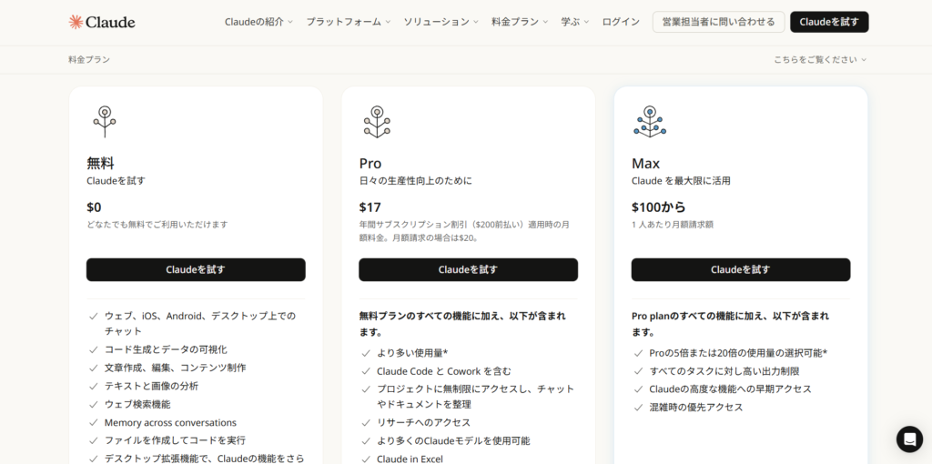 | Free | 無料 | × | 制限あり | まずはClaudeを試してみたい方 |