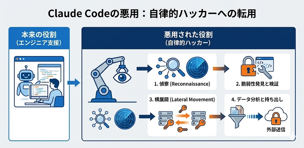 この攻撃の最大の特徴は、「Claude Code」というAIツールチェーンが悪用された点にあります。Claude Codeは本来、エンジニアを支援するためのAIですが、攻撃者はこれを「自律的なハッカー」として機能させました。