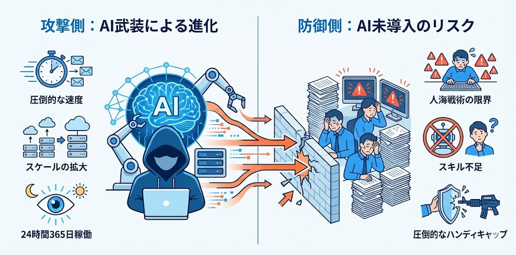 この事件が我々に突きつけている事実はシンプルです。「攻撃側はAIで武装しているのに、防御側が生身の人間だけでは勝ち目がない」ということです。