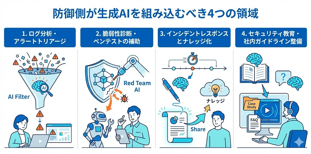 今回のレポートや最新のトレンドを踏まえ、企業が今すぐAIを組み込むべき4つのセキュリティ領域を解説します。