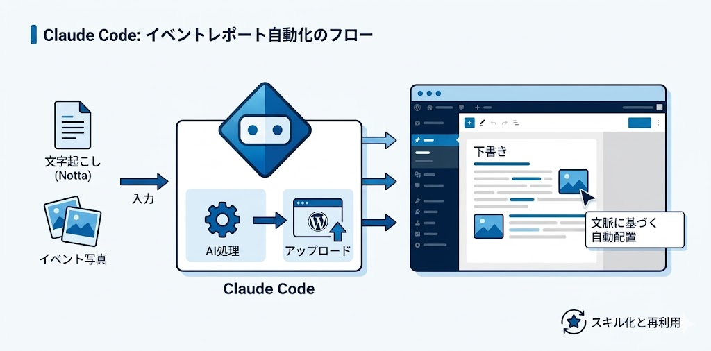 イベントの音声をNottaで文字起こしし、そのデータと当日の写真をClaude Codeに渡します。Claude Codeはテキストと画像をもとにレポート記事を自動生成し、WordPress APIを使って画像付きの下書きまでを一気に作成します。