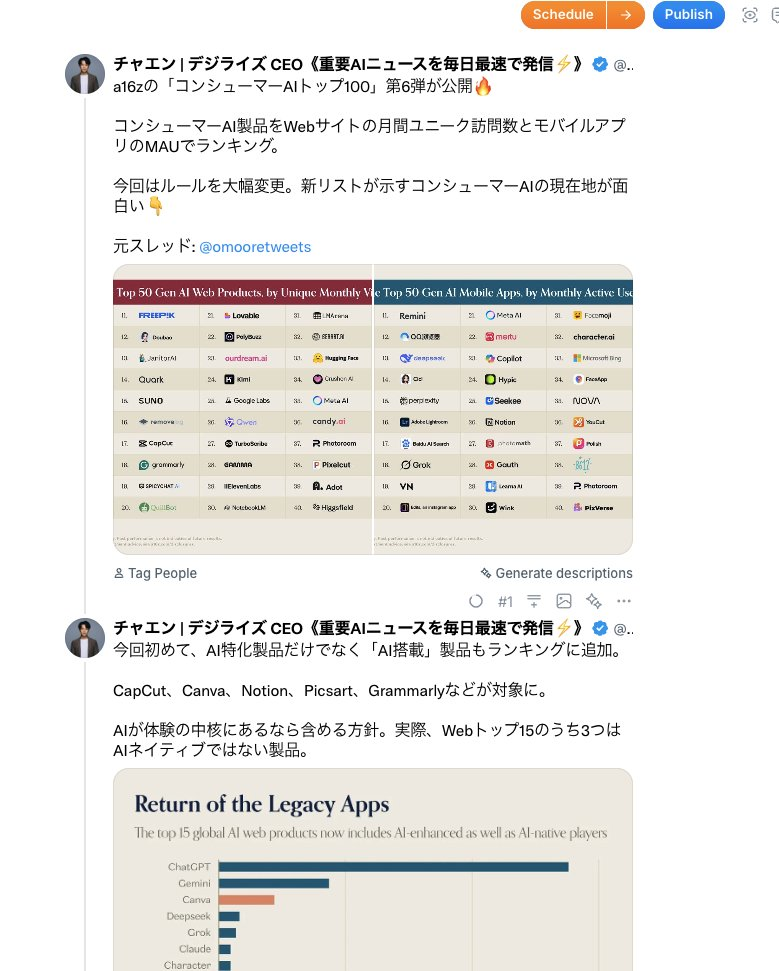 Typefullyは、X投稿の下書き保存やスケジュール管理ができるツールです。XのAPI(外部からサービスを操作するための仕組み)だけでは下書き保存ができないため、Typefullyと組み合わせることで「作成→確認→投稿」の流れをスムーズに実現しています。