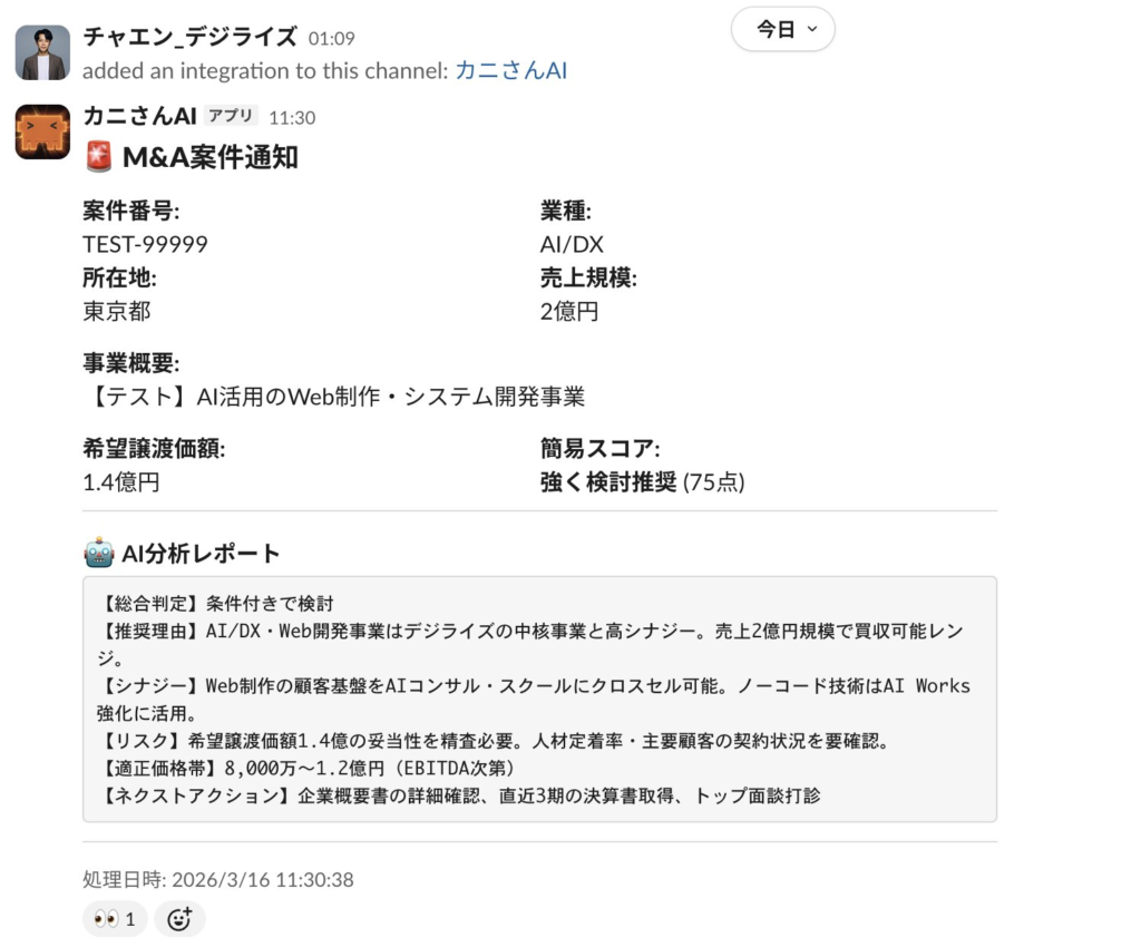 さらに、スコアリング結果はSlackにも自動通知されるため、「こんな案件が来ましたが、いかがですか?」というAIの分析コメント付きで確認できます。詳細な分析レポートはGoogle Driveに自動保存されるので、後から見返すことも簡単です。