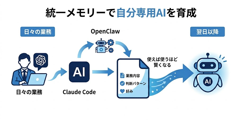 日々の業務をClaude Codeに実行させると、その内容をOpenClawが自動で整理し、MEMORY.mdというファイルに保存します。あなたの業務内容、判断パターン、好みなどが蓄積されていき、翌日以降のClaude Codeはその記憶をもとに、よりあなたに合った対応をしてくれるようになります。