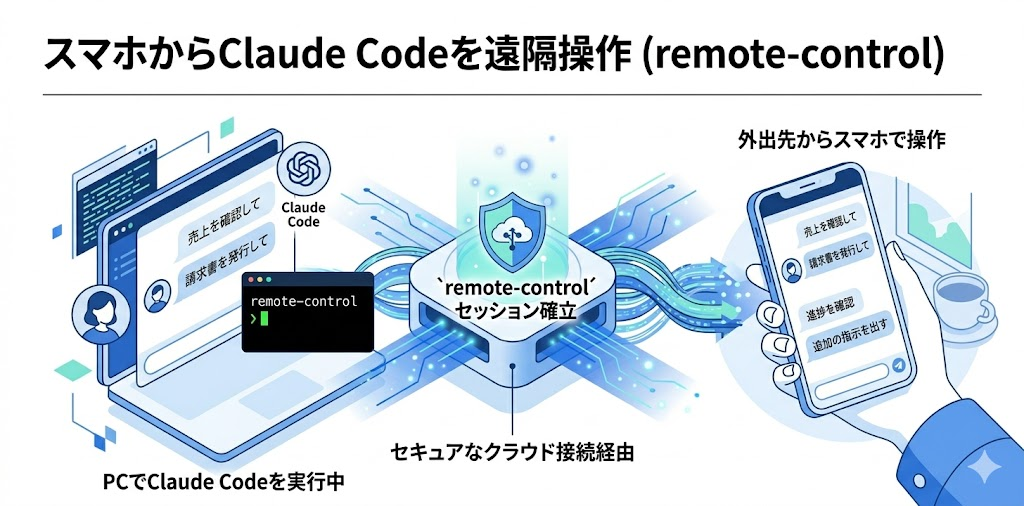 Claude Codeにはremote-controlというコマンドが用意されています。PCでClaude Codeを実行中に、ターミナルで remote-control と入力すると、スマートフォンのブラウザからそのセッションにアクセスできるようになります。
