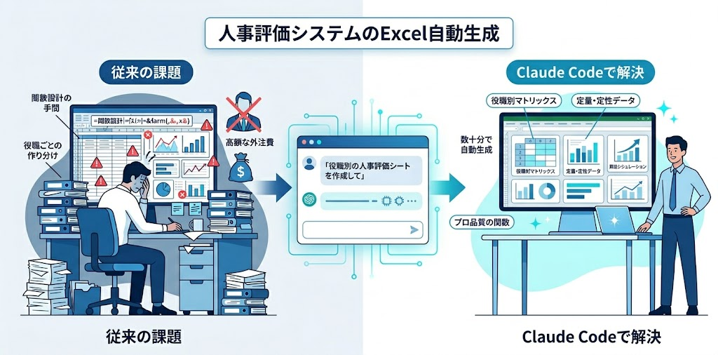 Claude Codeに「営業部長向けの人事評価シートを作って」と指示するだけで、以下の要素を含む本格的なExcelファイルが自動生成されます。