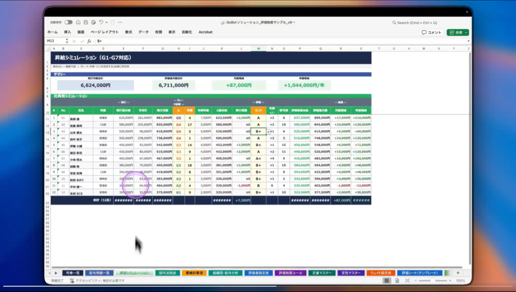 • 昇給シミュレーション: 評価結果に基づいた昇給額の試算機能