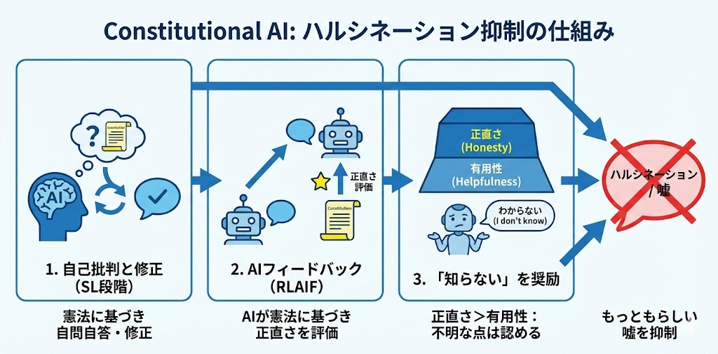 RLHFでは人間がフィードバックを与えますが、RLAIFではAI自身がフィードバックを生成します。このとき、憲法に基づいて「正直な回答」を高く評価するように設計されています。結果として、「嘘をついても評価される」という学習が起きにくくなるというわけです。
