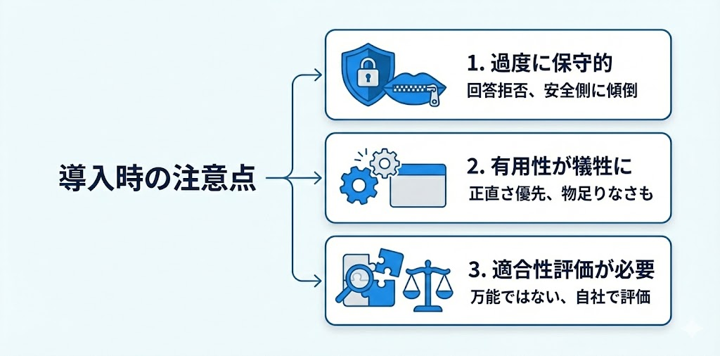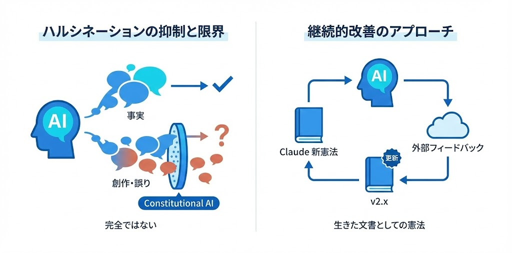 Constitutional AIは万能薬ではありません。あくまで「嘘をつきにくくする」設計であって、「嘘を完全に防ぐ」設計ではないんです。