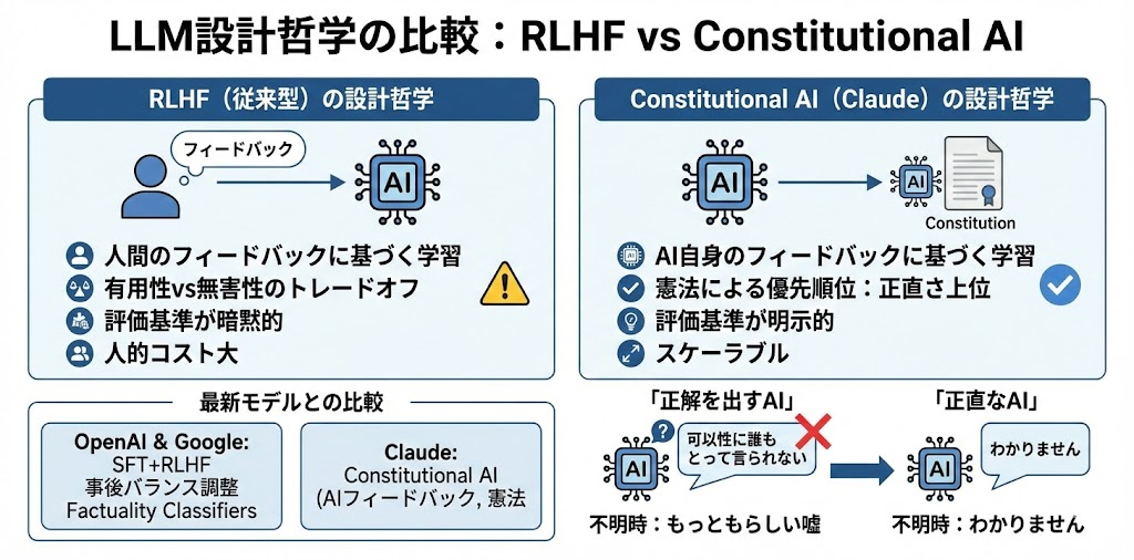 ここで、Constitutional AIと従来のRLHFの設計哲学の違いを整理しておきましょう。