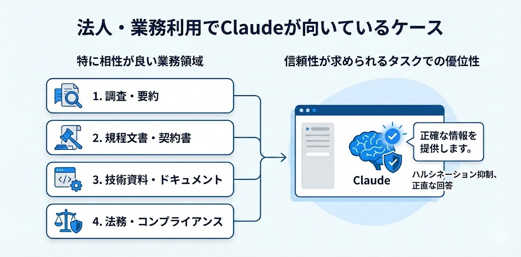 ここまでの話を踏まえて、Claudeが特に向いている業務領域を考えてみましょう。