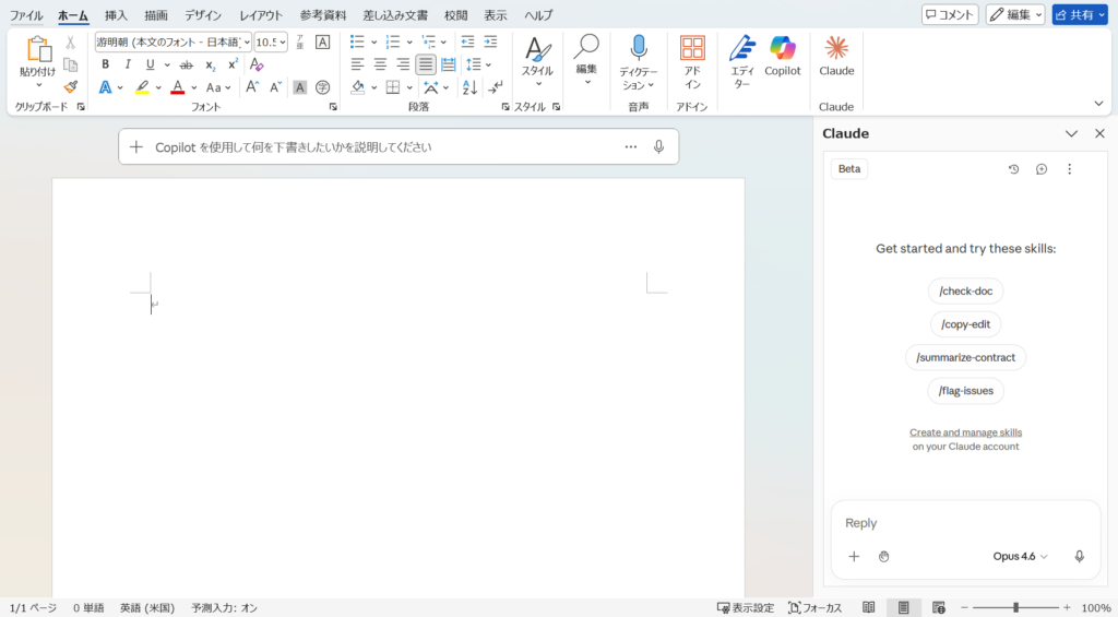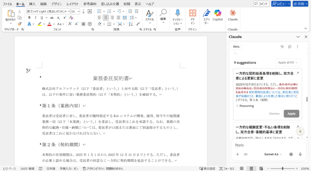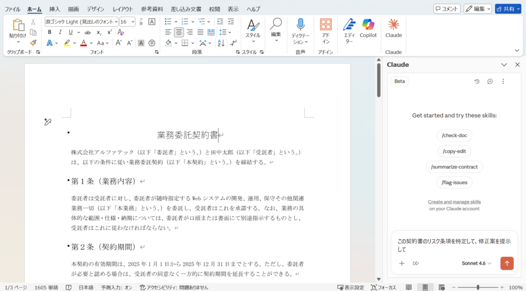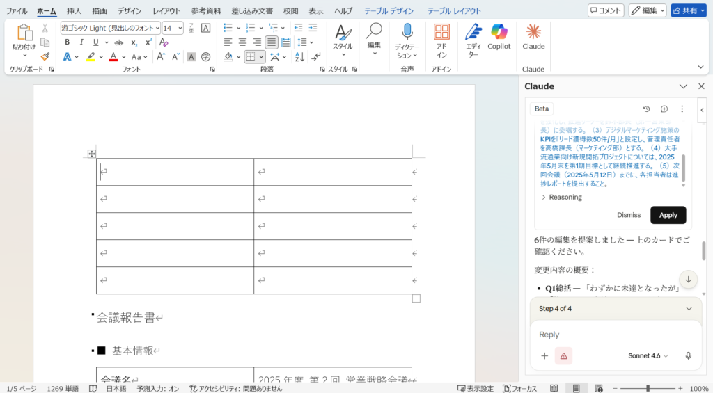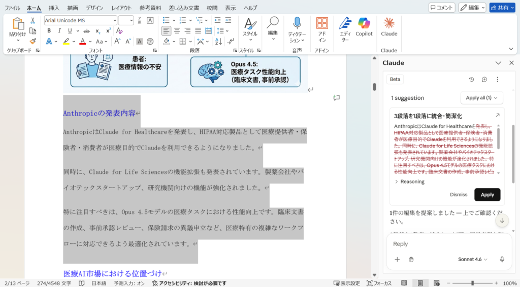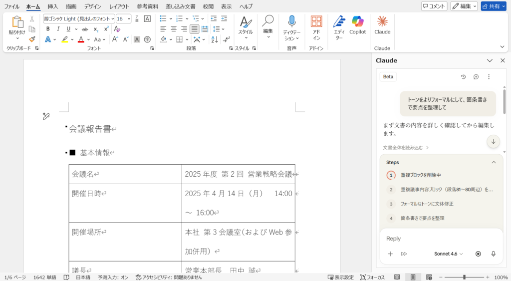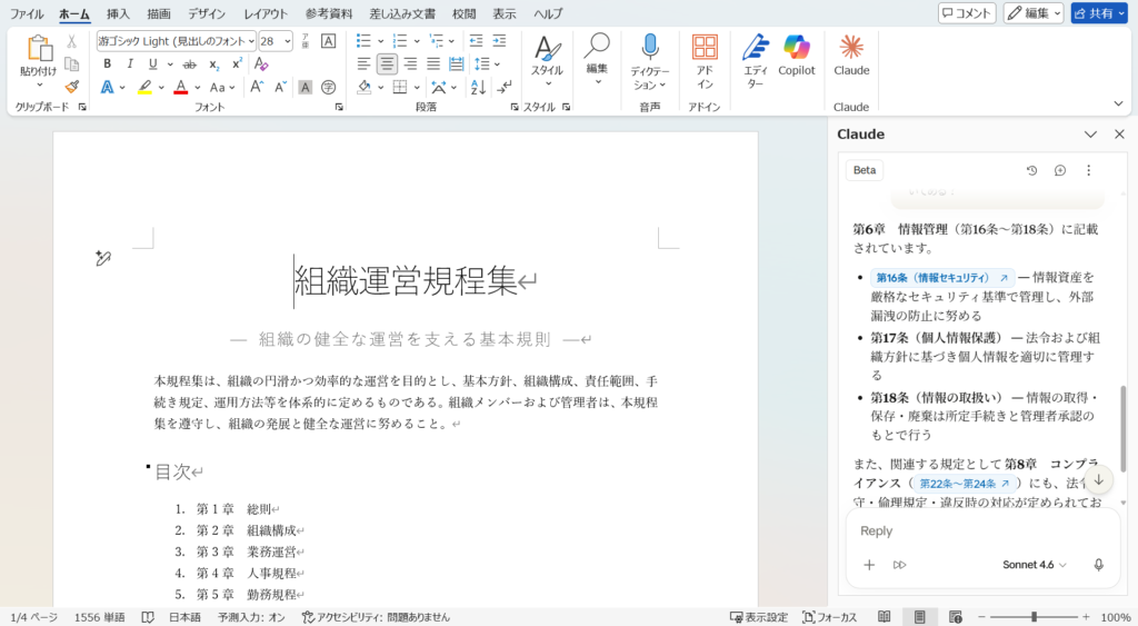 - Word内で完結: ブラウザでClaude.aiを開く必要がなく、Wordのサイドバーから直接指示を出せる