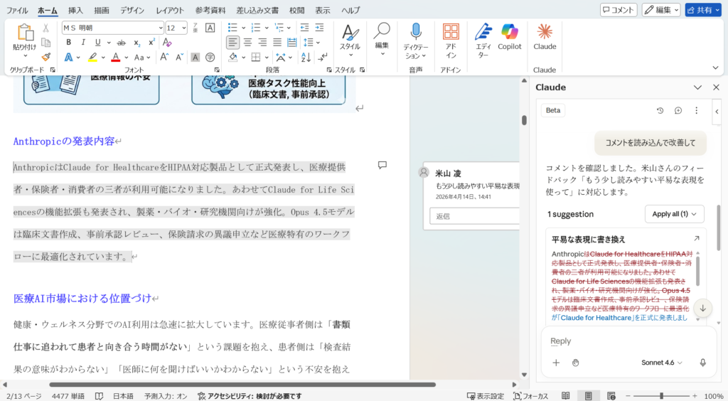 Claude for Wordは、レビュアーがコメントで残したフィードバックを読み取り、該当箇所の修正案を自動で生成します。「表現をもう少し柔らかくして」「データの出典を追記して」といったコメントに対して、Claudeが具体的な修正を提案してくれるので、手戻りの作業時間を大幅に削減できます。