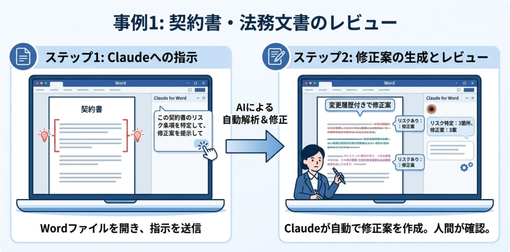 | 契約書レビュー | 「リスク条項を特定し、修正案を変更履歴付きで提示する」 |