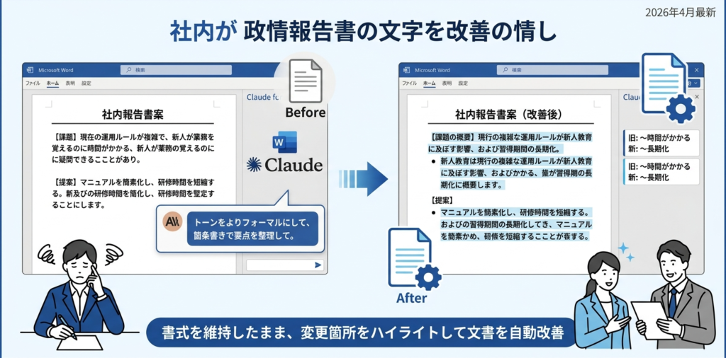 「報告書を書いたけど、なんとなく読みづらい」「上司にもう少しフォーマルにしてと言われた」——こんな場面でもClaude for Wordが活躍します。