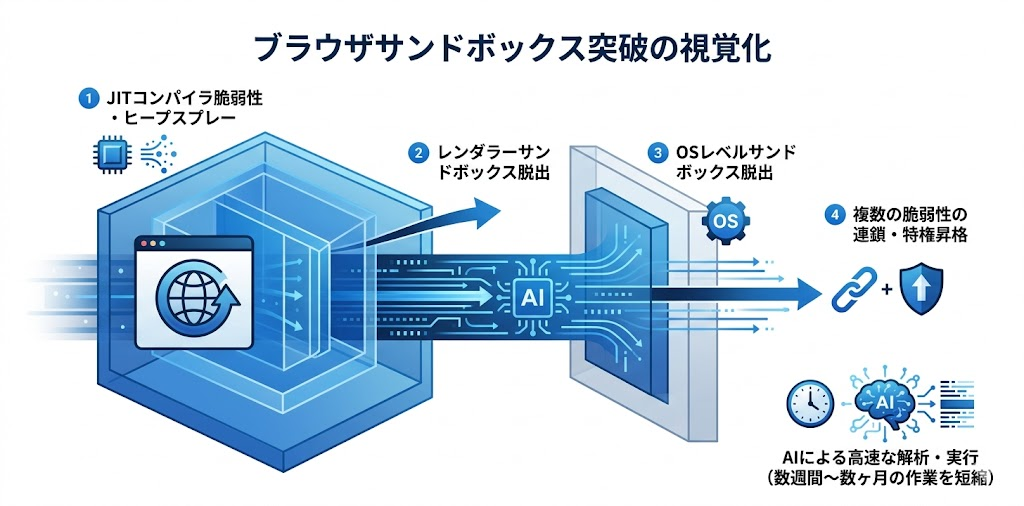 ブラウザのセキュリティ機構「サンドボックス」を突破するエクスプロイトも作成しました。具体的には:
