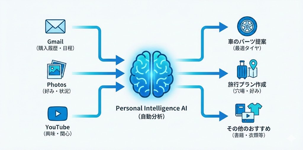 Personal Intelligenceは、Googleアプリと連携してパーソナライズされた提案を行う機能です。