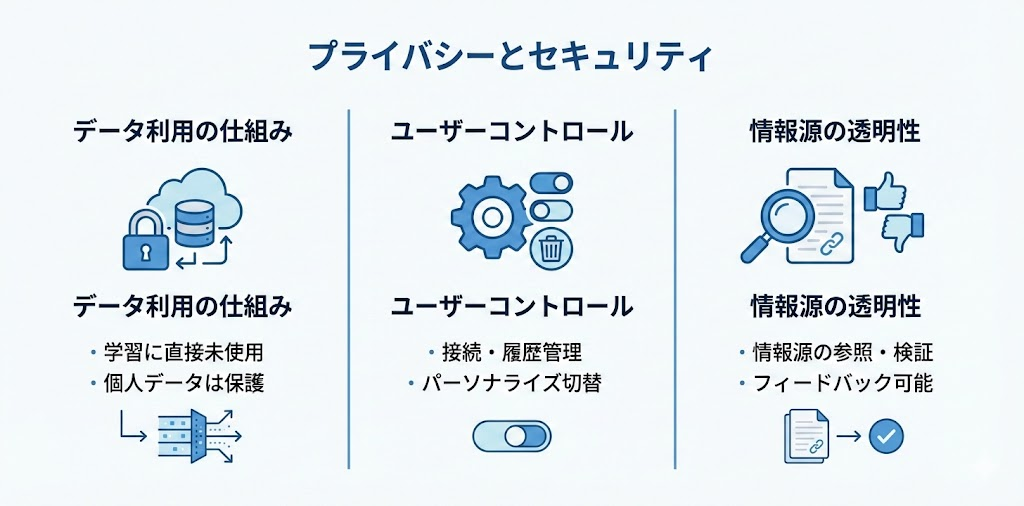 | 訓練に使われるデータ | 限定的なプロンプト・応答のみ(個人データはフィルタリング・難読化) |