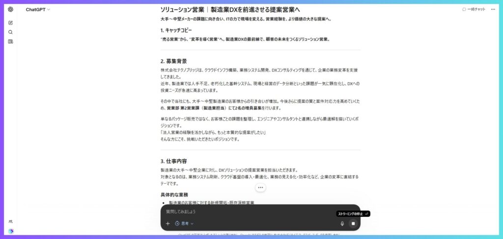 ポイント: 「会社の魅力」と「仕事の魅力」を分けて伝えるのがコツです。会社概要は使い回せるので、職種情報だけ差し替えれば複数求人を一気に作れます。出力後、実際の雰囲気や独自のエピソードを追記するとさらに魅力的になります。