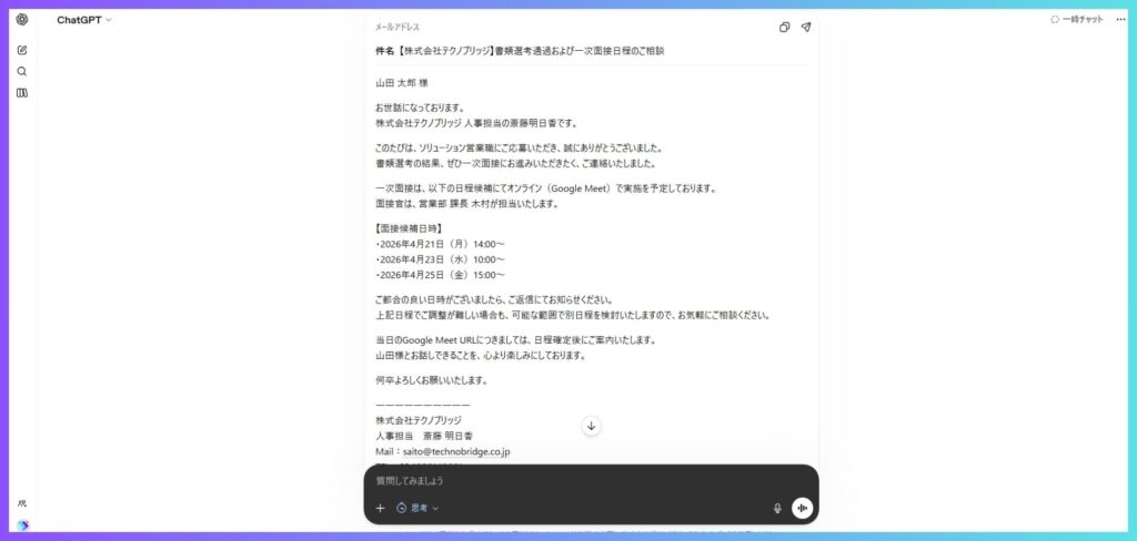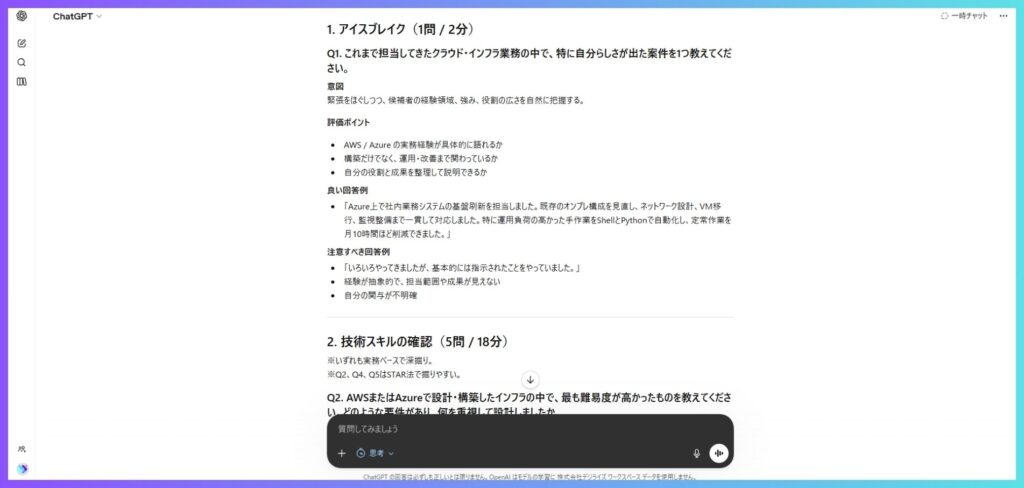 ポイント: 面接質問リストを標準化しておくと、面接官による評価のブレが減ります。出力結果をチームで共有し、「この質問は自社に合わない」「この質問は毎回聞きたい」とフィードバックしながらブラッシュアップしていくのが理想です。