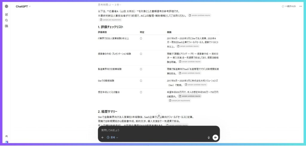 シーン: 応募者の職務経歴書を、一貫した基準で効率的に評価したいとき。