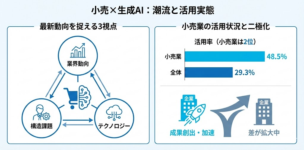小売×生成AIの潮流を理解するには、「業界動向」「構造課題」「テクノロジー」という3つの視点から押さえておく必要があります。