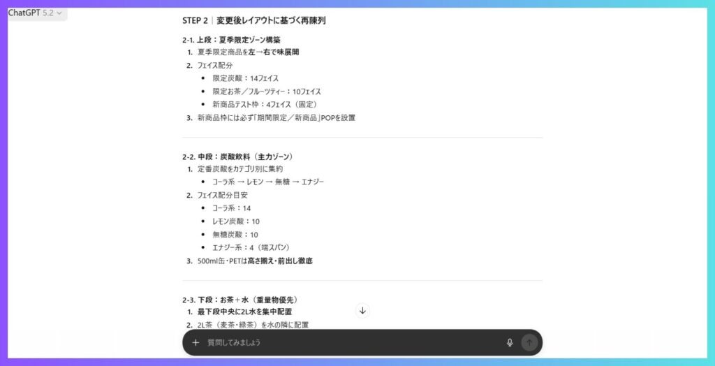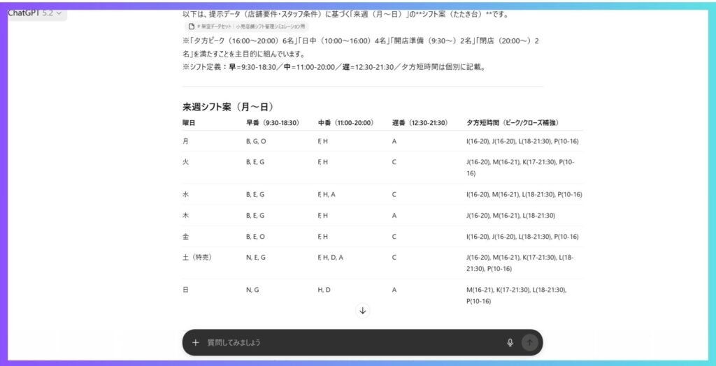 ポイント: 全員のシフト希望時間だけでなく、役職や得意不得意などの特性も入力することで、「社員がいなければならない」といった制約にも対応できます。ただし、労務管理上の判断(36協定、有給消化など)は生成AIに任せず、責任者が確認する必要があります。