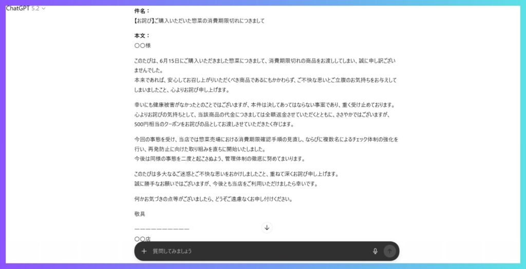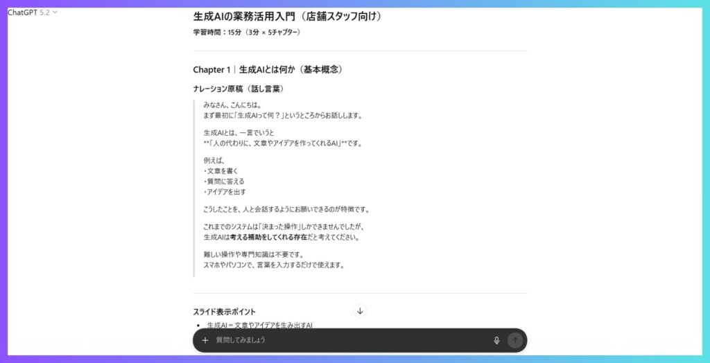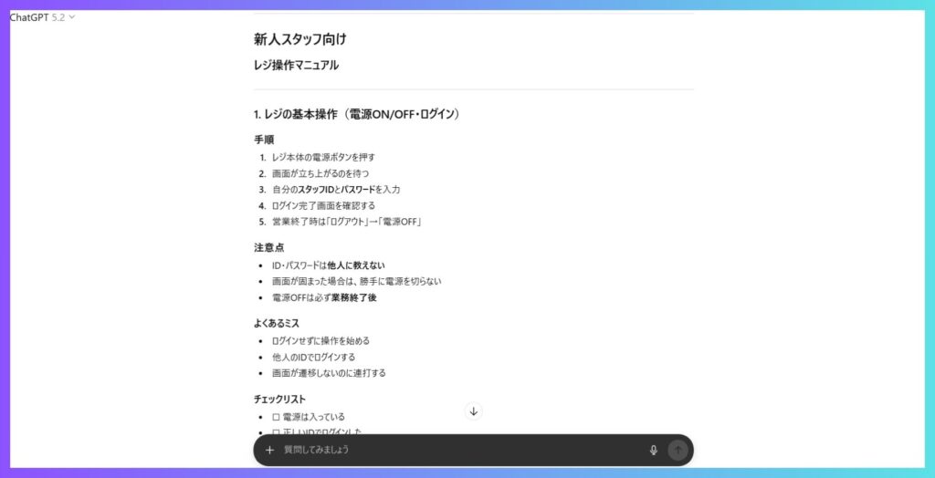 まずは「長い報告書の要約」「週末セールのPOP案出し」「取引先へのメール下書き」など、リスクが低く効果を実感しやすい業務から試してみてください。