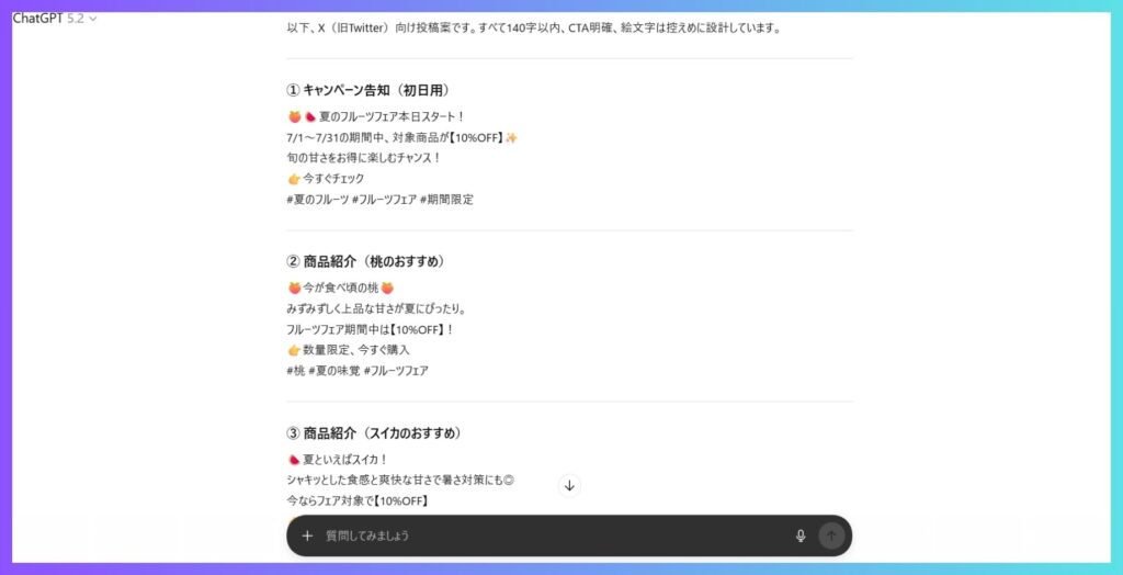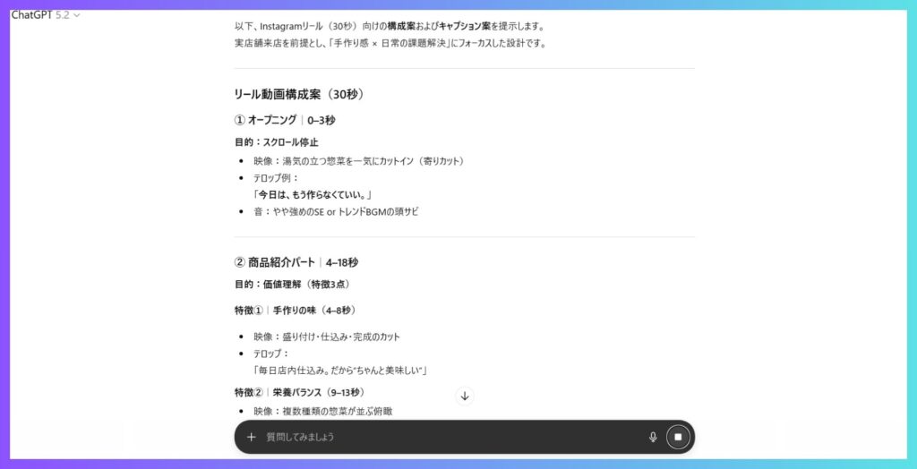- 作業時間を1/3に短縮:トークスクリプトやLP、SNS原稿などのコンテンツ作成をAIに任せることで、大幅な時間削減を実現