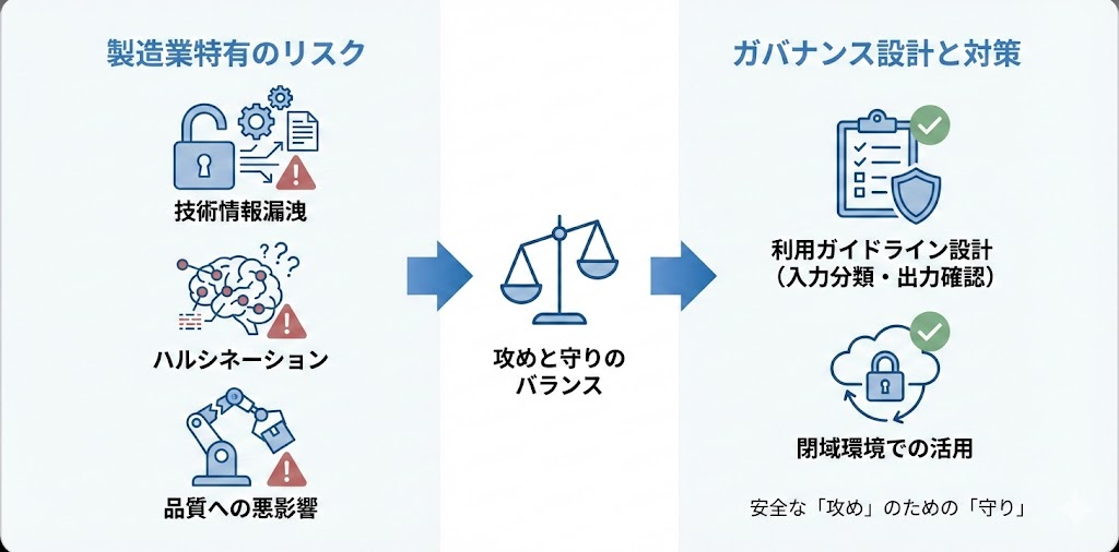 「攻め」の活用を進めるほど、「守り」の重要性が増します。製造業特有のリスクとガバナンスの要点を整理していきましょう。