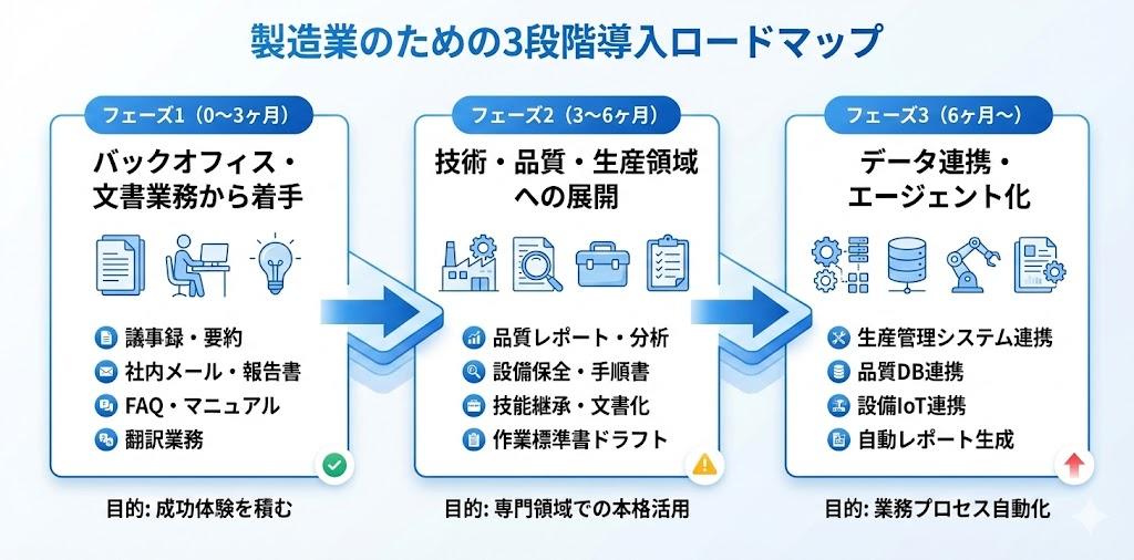 「どこから始めればいいのか分からない」という声をよく聞きます。製造業における生成AI導入の3段階ロードマップを提案します。