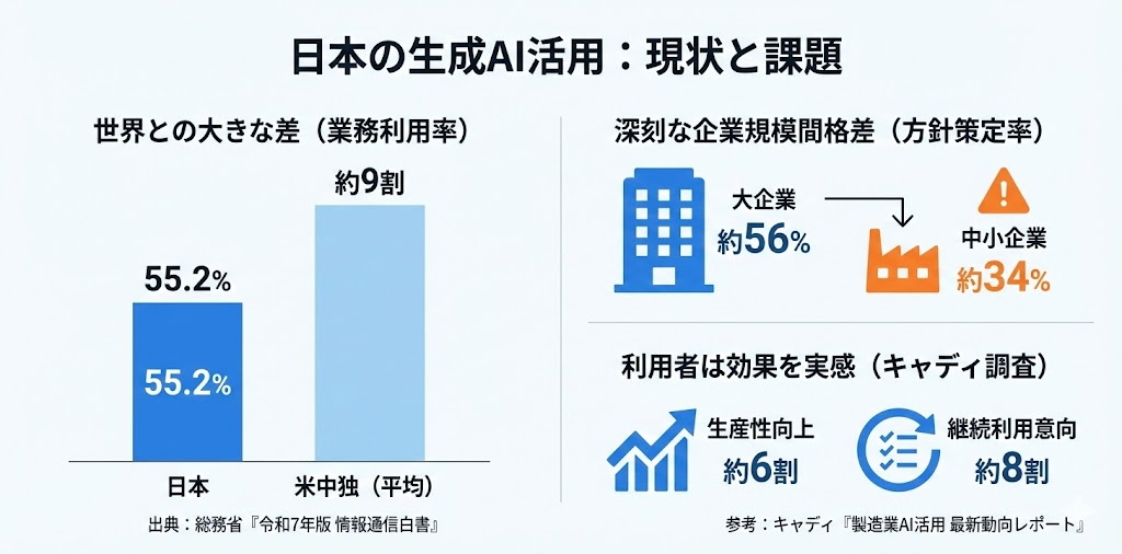 一方、キャディが2025年に実施した製造業AI調査では、AIツール活用者の約6割が「生産性向上」を実感し、約8割が「今後も活用し続けたい」と回答しています。使い始めた人は確実に効果を感じているのに、まだ踏み出せていない企業が多い——これが日本の製造業の現状です。