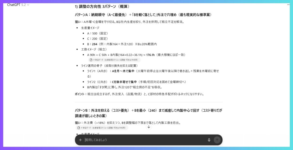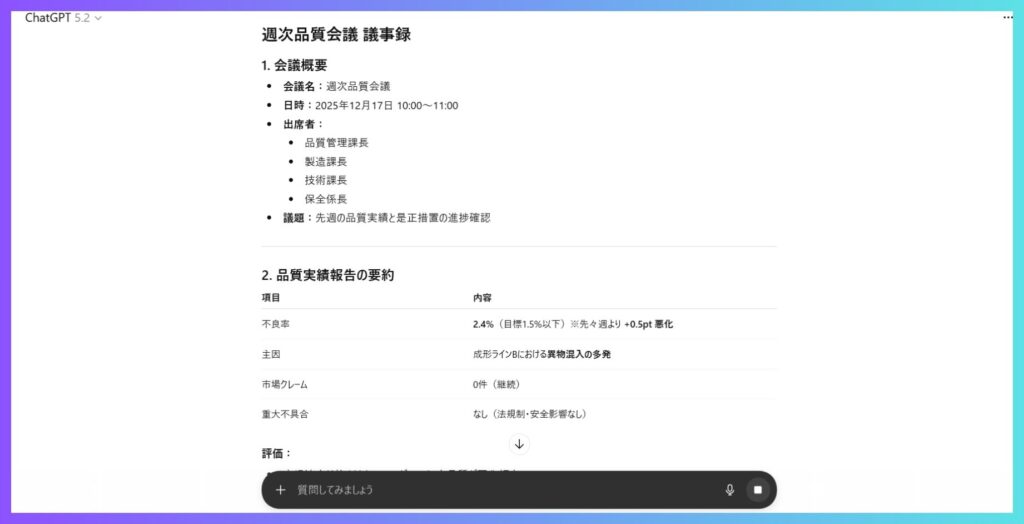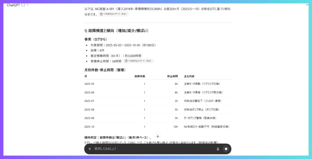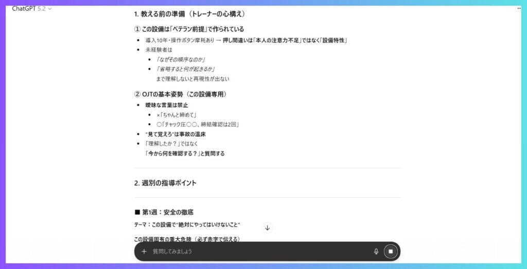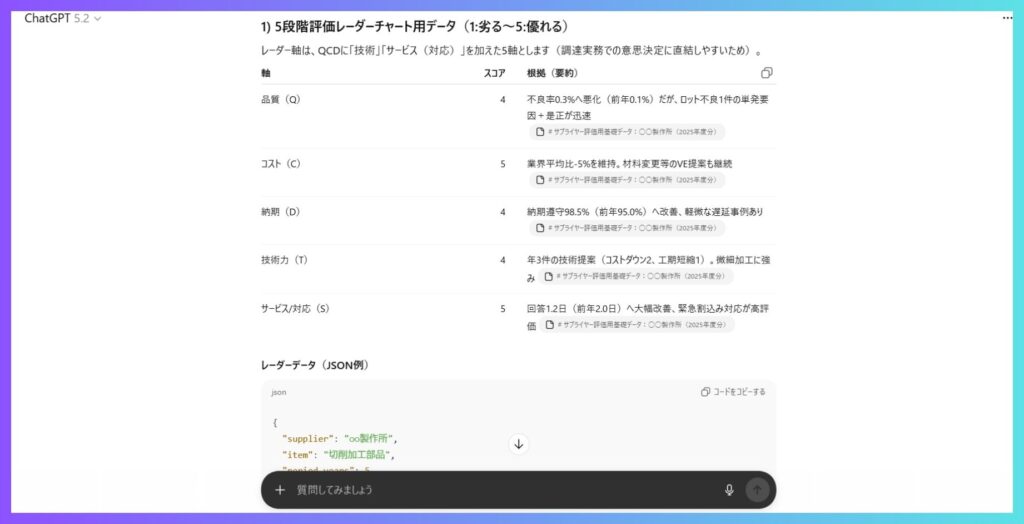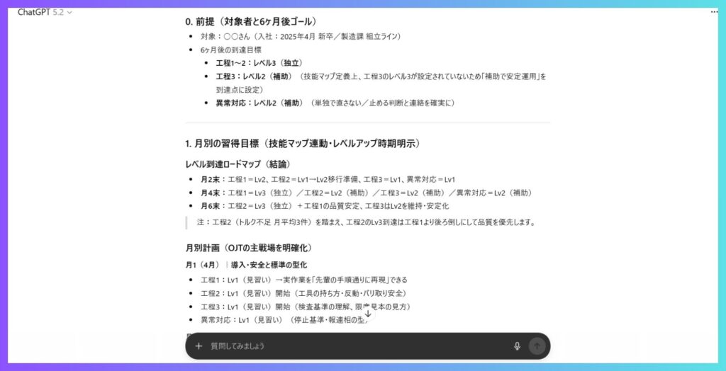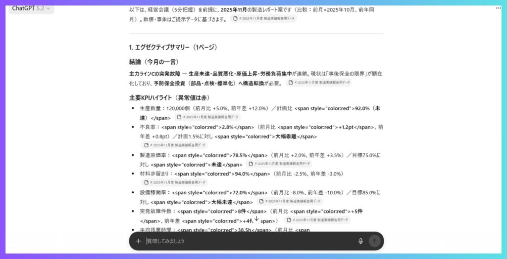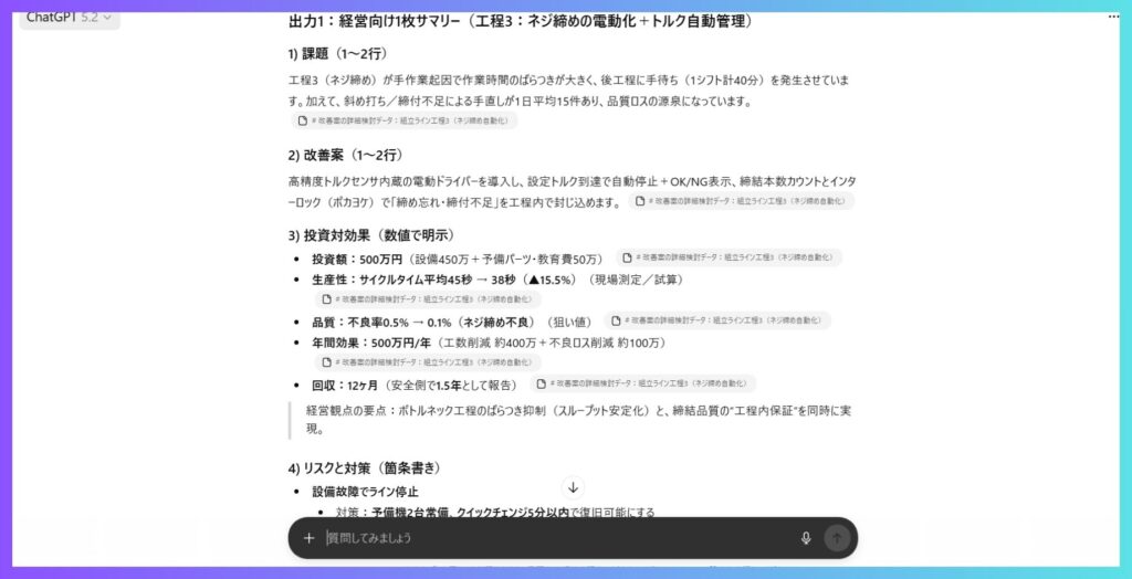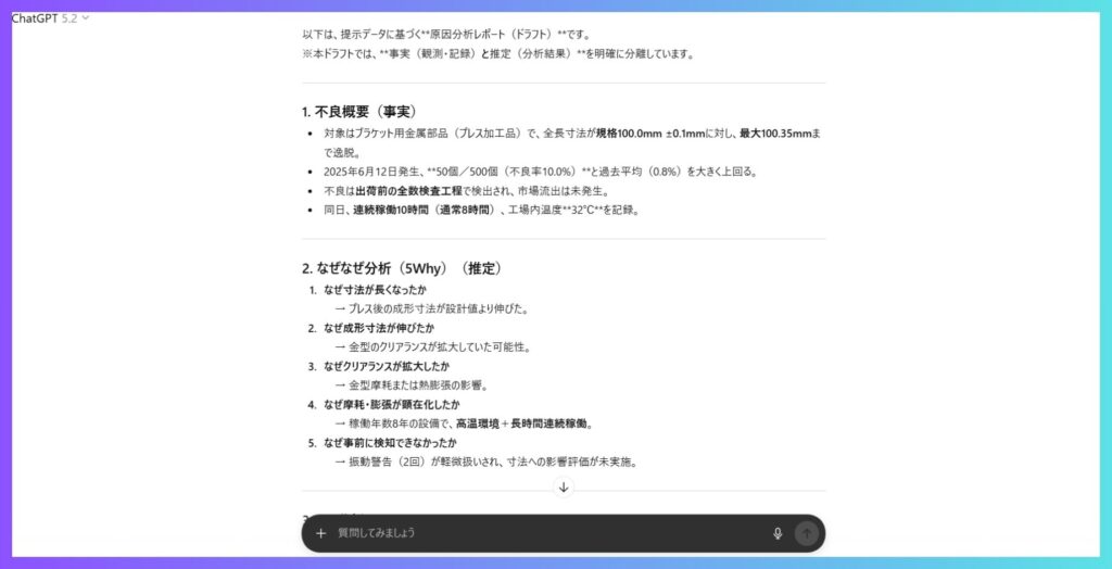 ポイント: 情報や分析の方法をたくさん与えれば与えるほど、より的を得た回答が得られます。また、出力された分析結果は必ず現場の実態と照合してください。AIの提案をベースに、現場知見を加えて最終化することが重要です。