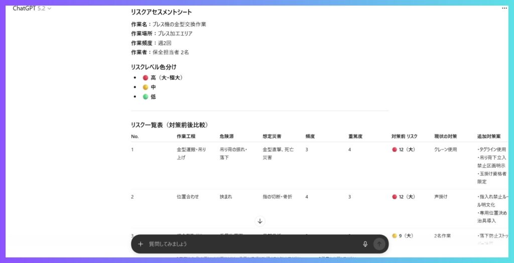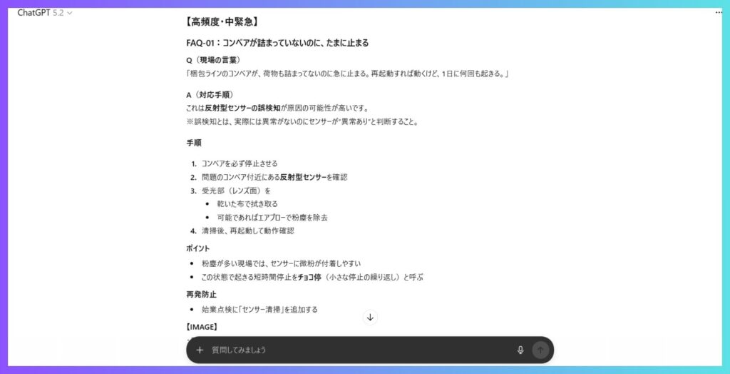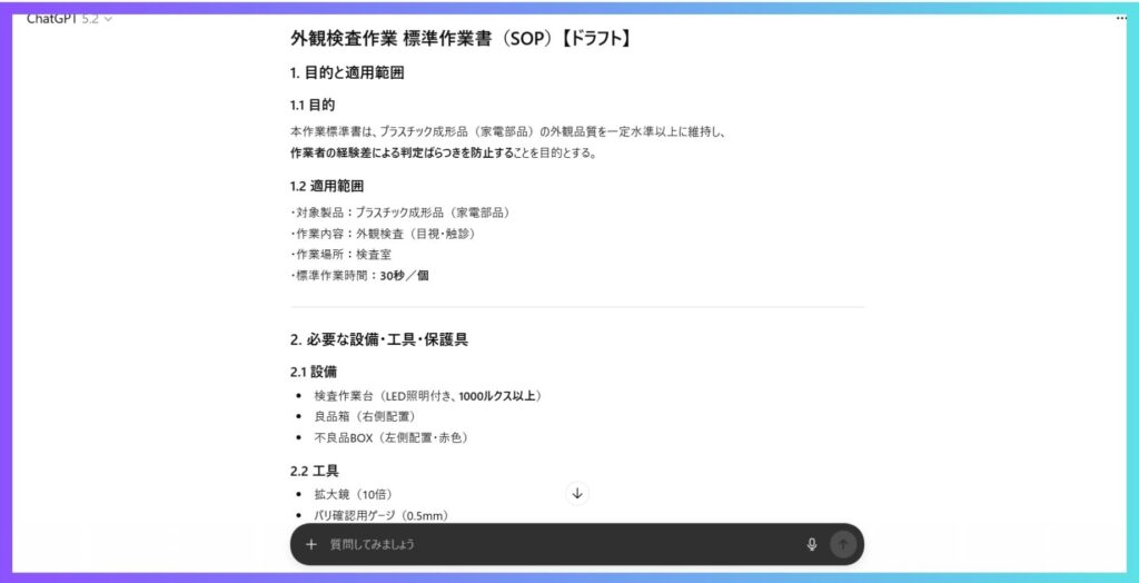 | 品質への悪影響 | AIが作成した検査基準や作業手順の誤りが品質不良につながる | ・AIはドラフト作成のみ ・正式化前の検証プロセス |