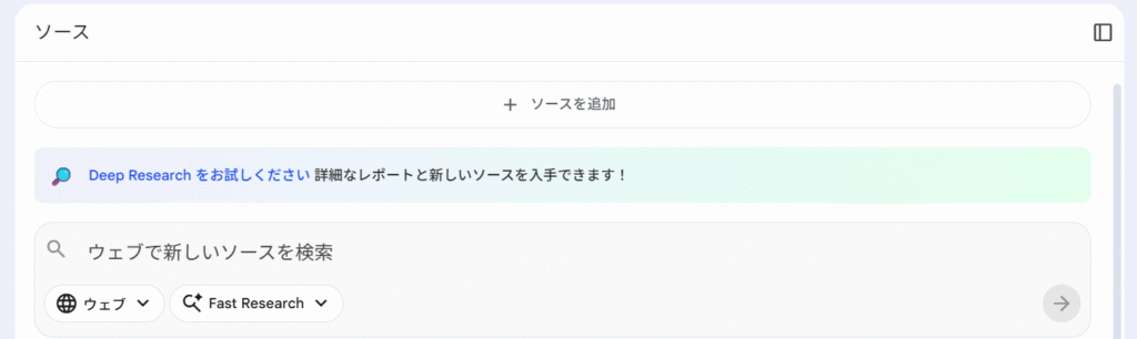 ここで、Fast Researchとは、既存の「ソースを探す」機能で、すぐに情報が欲しいときに活用できます。また、Googleドライブの情報を探したいときにもこの機能は活用できます。