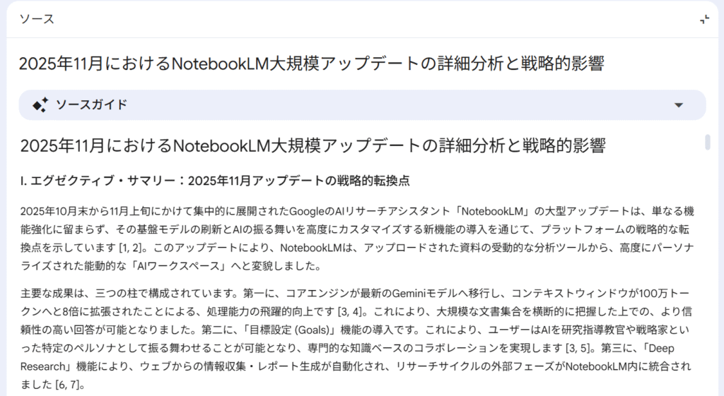 これにより、従来の「要約させる」使い方から一歩進み、NotebookLMをリサーチツールとして活用する幅が大きく広がりました。特に、未知のトピックに関する初期調査や、複数の情報源を横断的に比較検討する作業において、時間の大幅な短縮が期待できるでしょう。