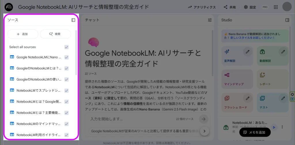 では、具体的にNotebookLMでどんなことができるのか、その驚きの機能を一つずつ見ていきましょう。NotebookLMの画面は大きく分けて、左側の「ソース」、中央の「チャット」、右側の「Studio」の3つのパネルで構成されています。この3つを使いこなすことが、NotebookLMマスターへの第一歩です。
