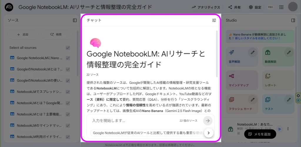 ソースを追加すると、中央のチャットパネルに、アップロードした全てのソースの概要が自動で生成されます。まずはここに目を通して、AIが資料全体をどのように理解したかを把握しましょう。 - ステップ3:チャットで質問