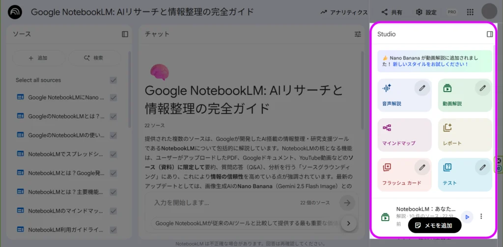 この後紹介するレポートやマインドマップなど、NotebookLMが生成するコンテンツは、すべてこのメモ欄に保存されます。
